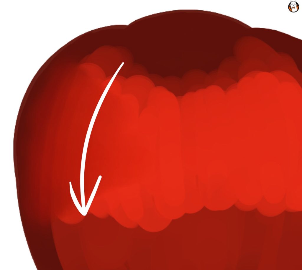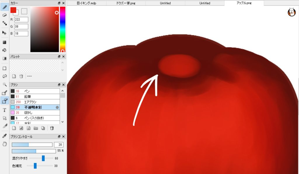 では次に、リンゴの上部の茎部分の凹み、その影を塗っていく。どこか分からない人は前作業時のリンゴと見比べてみてほしい。