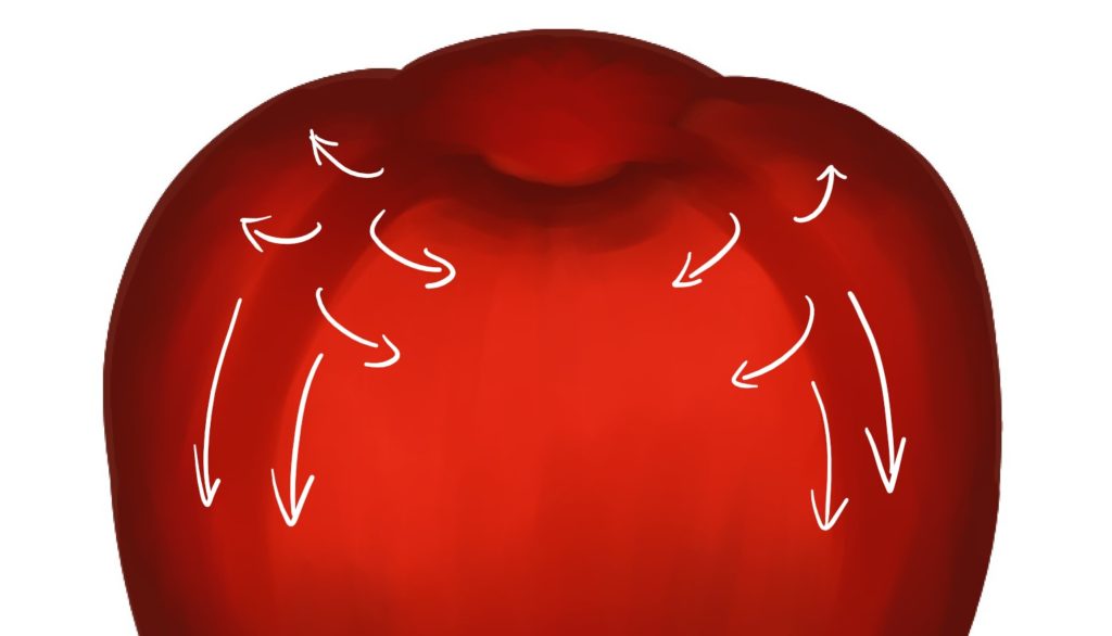 のように影の内側から外に、リンゴのカタチをイメージしながら筆を運ぶと良い。
