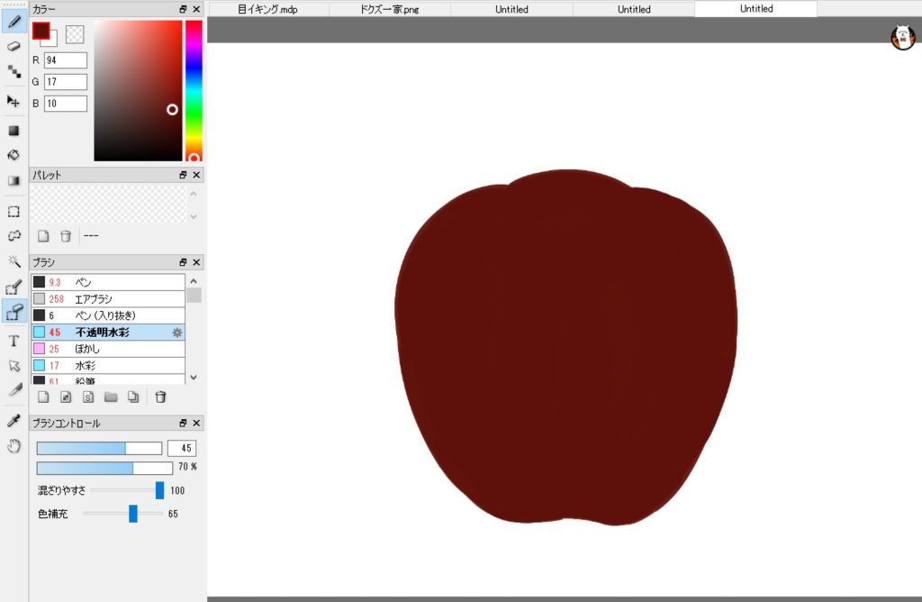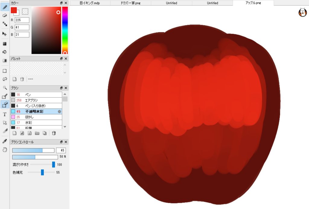 リンゴの形を描くときに留意したいのが「不透明度」と「色補充」だ。