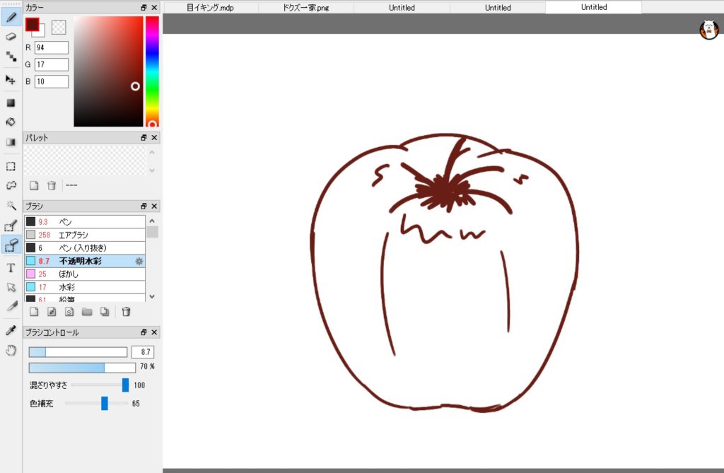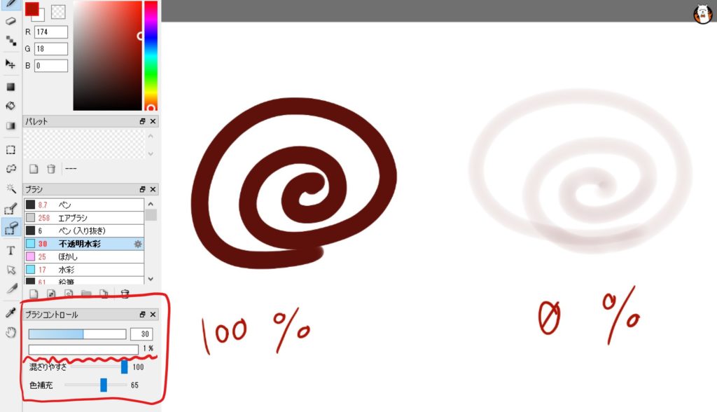 しっかりと色を出したい時は不透明度・色補充は高めに設定するのが肝だ。