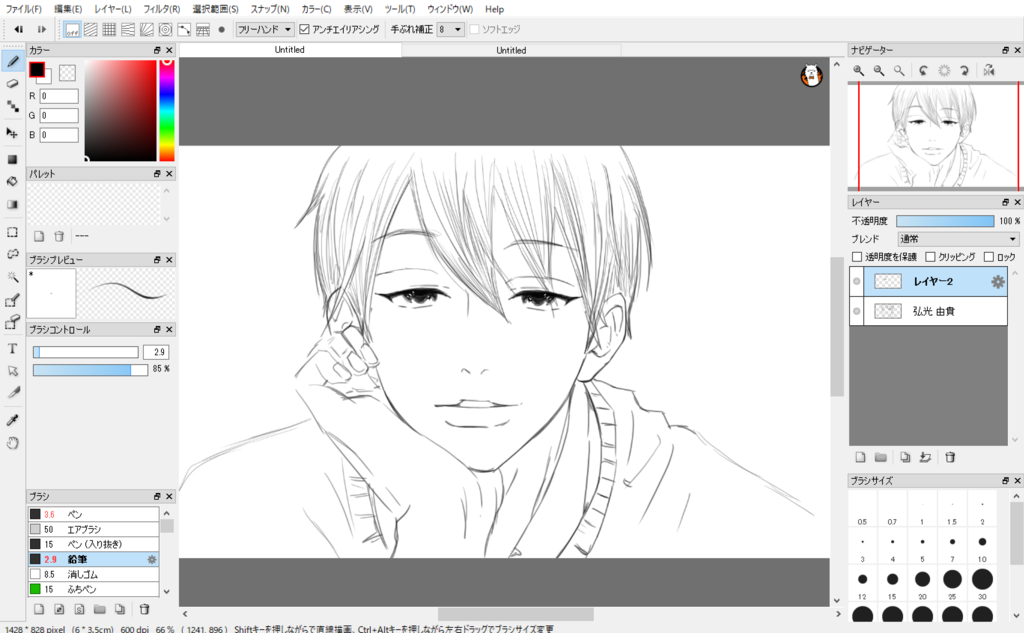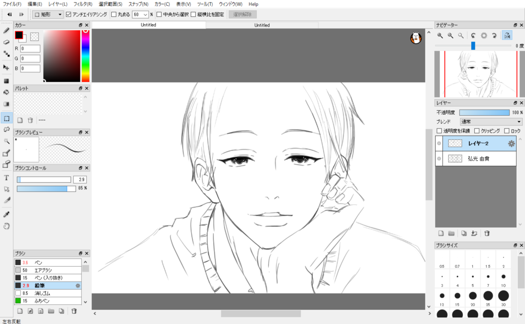 レイヤーウィンドウの上に拡大縮小とかいろいろいじれるレイヤーがあるので、そこでレイヤーを一括で左右反転できるます。デッサンの崩れがないか確認しておきましょう。