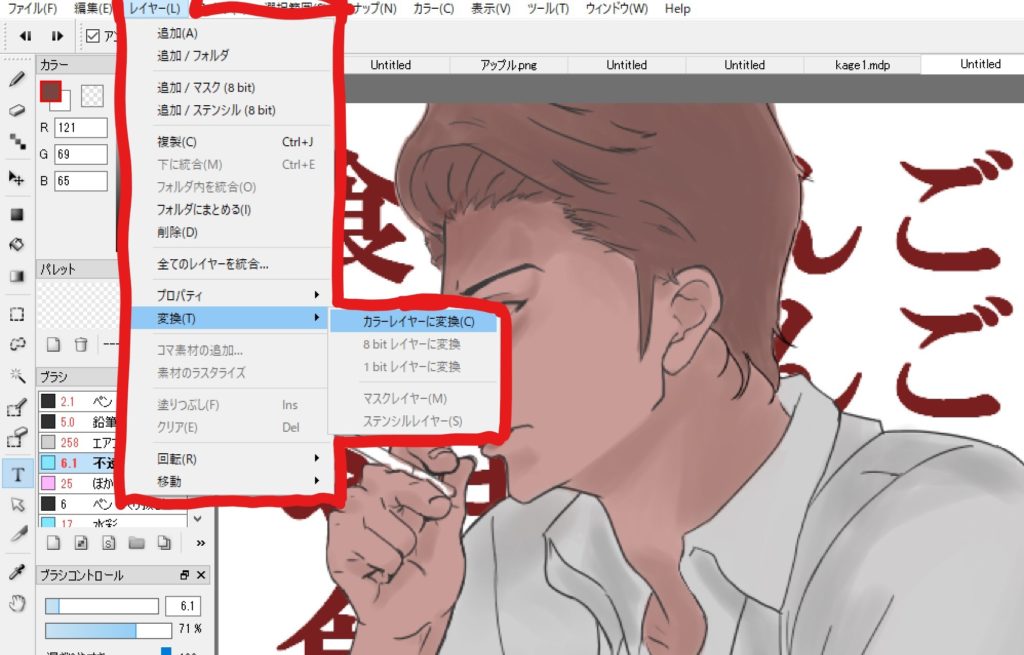 テキストレイヤーを統合したい場合は、まずレイヤーをカラーレイヤーに変換してやる必要がある。