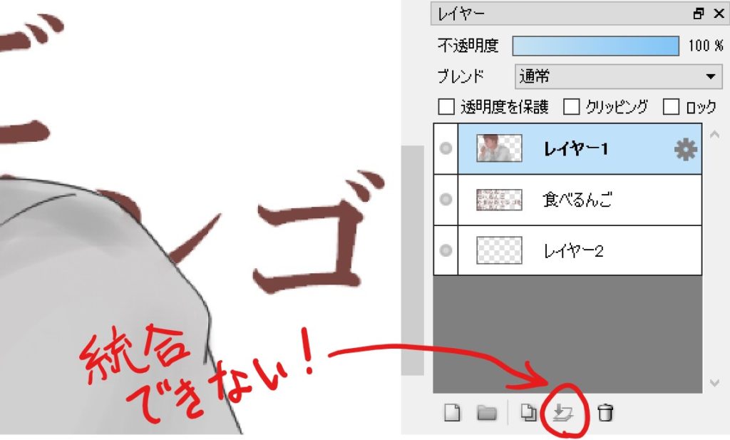 統合されるレイヤー(下のレイヤー)の「不透明度」に統合後のレイヤーの「不透明度」が強制的に合わせられてしまう。ので、統合前はレイヤーの「不透明度」を調整しておこう。