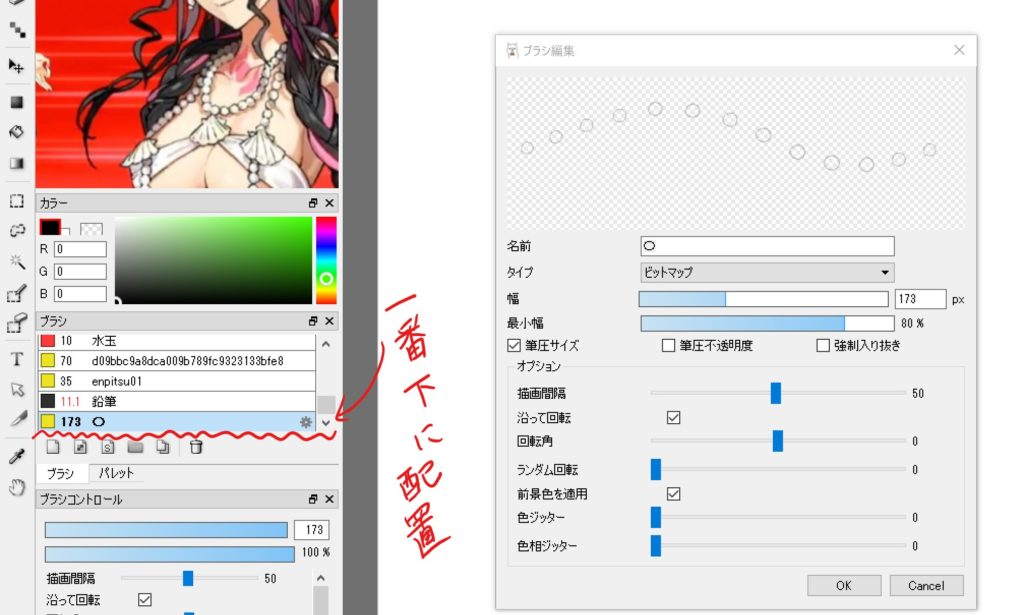 今回はタイトルにもあるように丸(〇)が連なったブラシを作るよ。