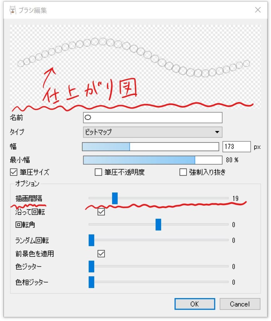 そんな感じで上のような感じでオリジナルブラシが作成された。