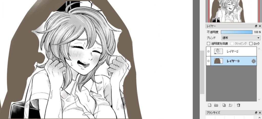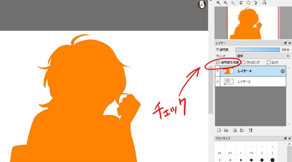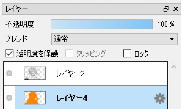 そしたら一方のレイヤーの「不透明度を保護」にチェックを入れて、シルエットに適当な色で着色。