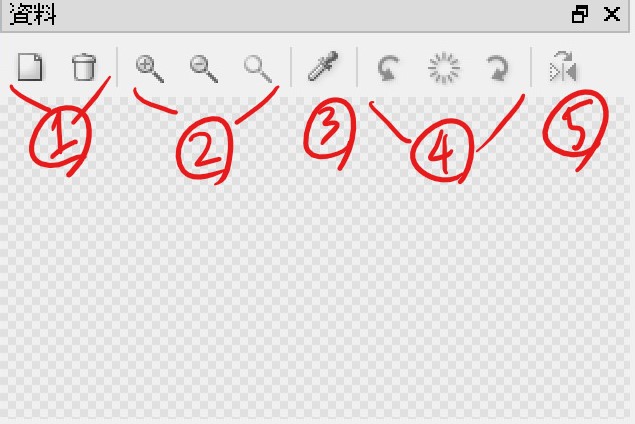 ①の左側が『資料を開く』、右のゴミ箱が『削除』。