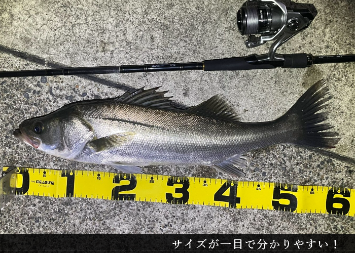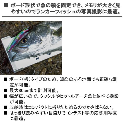 ランカーフィッシュの計量・写真撮影に最適なボード型メジャーです。幅が広いので、タックルやヒットルアーを魚と並べて撮影が可能。シーバスアングラーにおすすめな釣りメジャーです。