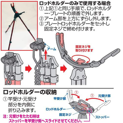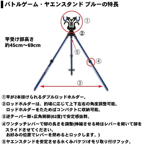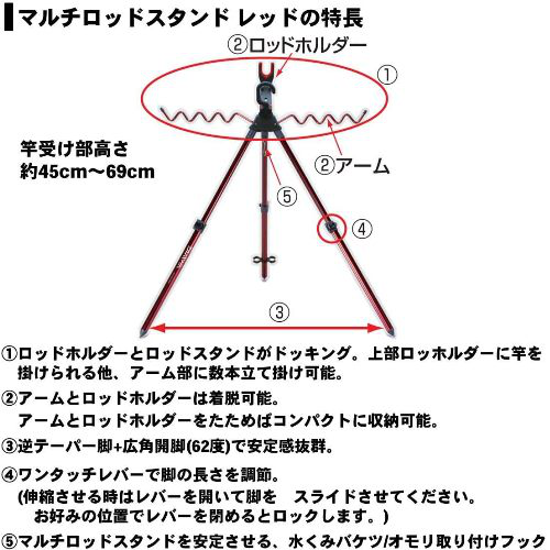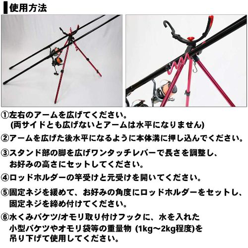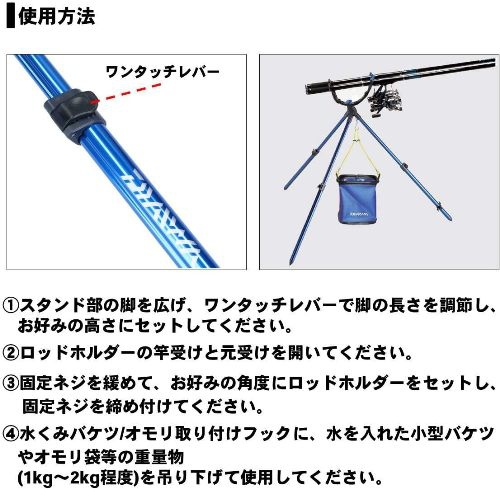 角度調整可能な可動式竿受と竿掛が付いた2WAY仕様の三脚です。サイズバリエーションが非常に豊富ですが、特に使用目的が明確でない方は2段-75㎝、サーフなどで使用される方は3段-115㎝がおすすめです。