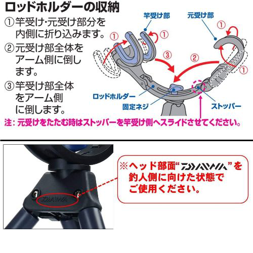上部が細く、下部が太い逆テーパー脚部構造のため低重心で安定感のあるDAIWAの竿立てです。ワンタッチロック機構で脚の長さを一発で調整できたりと、流石はDAIWAのロッドスタンドといったところ。竿受けもしっかりとした構造になっており、全体的にスタイリッシュで格好良いです。