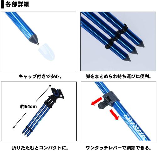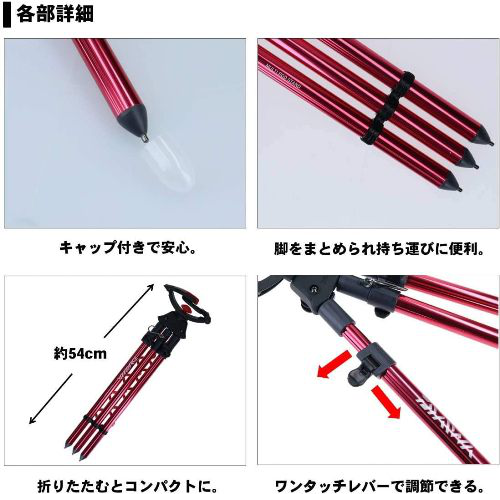 価格の割にシッカリ作られている釣り用三脚です。長さの調節もワンタッチスライド式を採用しており、簡単に行えます。サイズ感も丁度良く、堤防からサーフまで満遍なく使える万能釣り三脚でしょう。