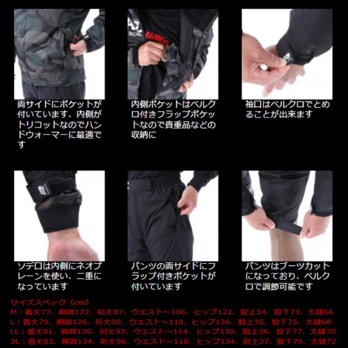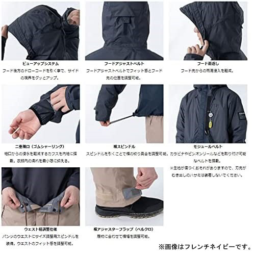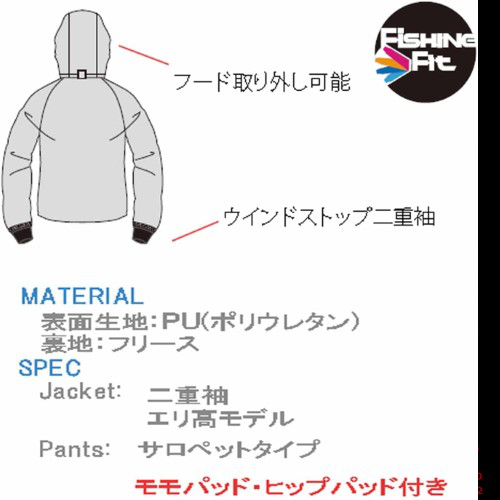 釣りにおける腕のアクションがしやすいよう考慮された立体裁断、アップスウィングパターン採用されているシマノの防寒着です。着脱式フードやアジャストタイプのパンツ裾など、釣りに最適なレインウェアとなっています。