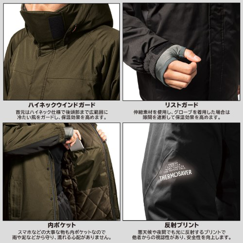 袖口からの冷気の浸入を堰き止めるリストガードを採用された防寒着です。腕の上下運動を容易にするアクションカットになっており、作業時のストレスを軽減。右袖に再帰性反射プリントを使用したデザインプリントを採用しており、夜間時でも安心して着用できます。