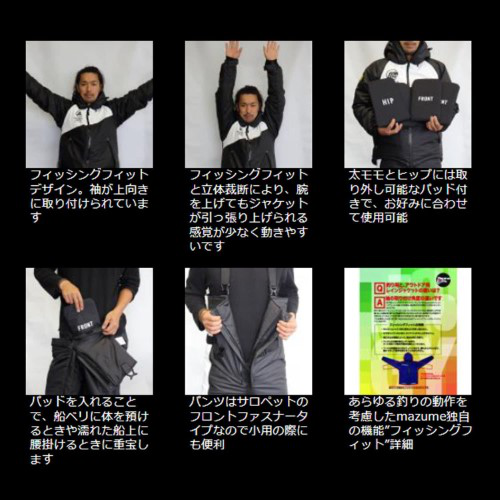 PU素材+中綿で保温性抜群の極寒仕様の防寒着です。必然と厚着になる冬のオフショアでは”動きやすさ”は防寒機能と並ぶ必須機能です。完全防水、防風でありながら適度に伸縮性のあるPU生地に、mazume独自の機能”フィッシングフィット”を搭載。さらに釣りの各動作を想定した立体裁断を採用。船釣りにおすすめな防寒着です。