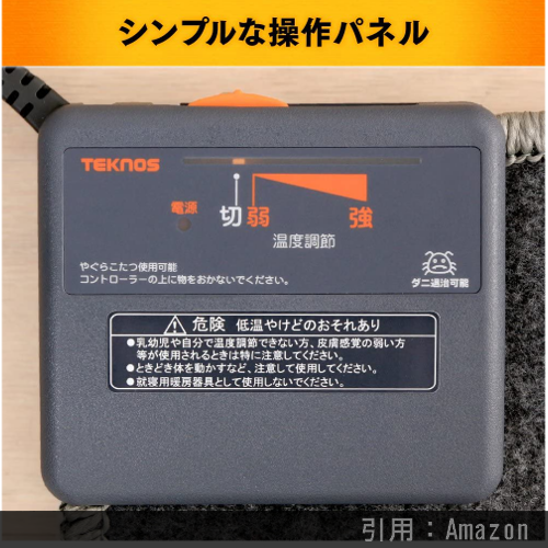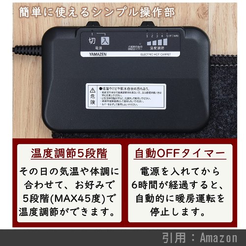 価格が非常に安価ですが、『買ってよかった』というレビューが非常に多いホットカーペットです。パナソニック製品などに比べるとやや付随機能が少なく感じますが、シンプルな操作パネルで操作しやすいです。温度は最大約45℃まで、無段階で調整できます。お好みのカーペットと併用することで、さらにぽかぽか心地良いでしょう。