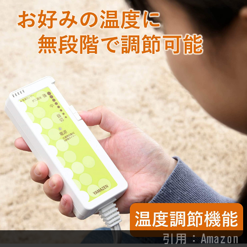 段階、無段階という風に温度を調節できるので非常に便利です。パナソニックなどのホットカーペットには『省エネ』ボタンのような機能もあり、節電にも効果的。