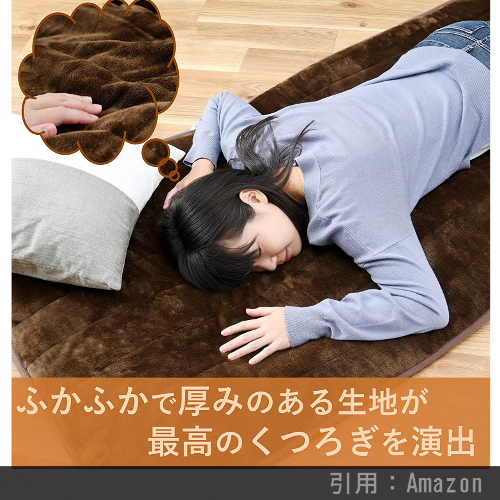名前にもある通り、カーペットとしてではなく、ソファの上などでも使える『どこでも』性能の高いホットカーペットです。中綿が多いのでフカフカしており、布団などに敷いてもグッスリ眠れることでしょう(1畳サイズの場合は寝相に気を付ける必要がありますが…)。
