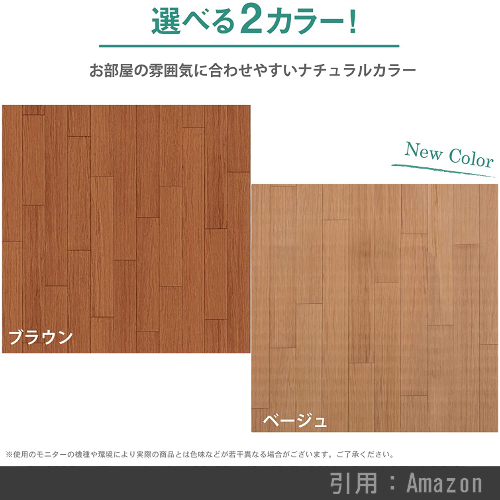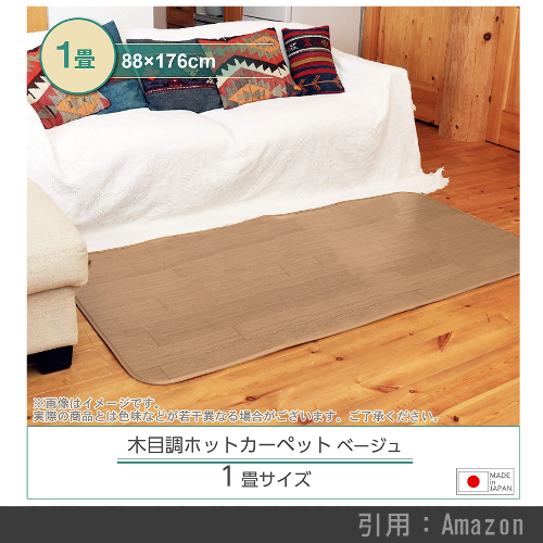 木目調のデザインのホットカーペット。表面がフローリングのようにすべすべしているので汚れに強い。キッチンに敷く方や、ペットを飼われている方におすすめ。