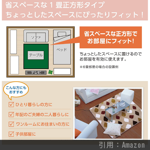 ワンルームマンションは勿論のこと、子供部屋や部屋の隅(ペット用)など、色々な場所で活躍する小型のホットカーペットです。消費電力も低く、サイズも小さいため節電に◎。サイズやデザインは他にも色々あるので、自分の部屋と大きさ・雰囲気に合った選択できるのも素晴らしいです。