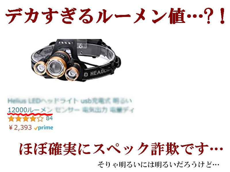 Amazonで『10000ルーメン!』と表記された海外メーカーのヘッドライトがありますが、ほぼ全て誇張広告です。10000ルーメンって君、どんな軍用大型サーチライトなんだよ…。ジェントスや富士灯器のような自社テストをしっかりしてるメーカー以外はあまり信用できないので注意。