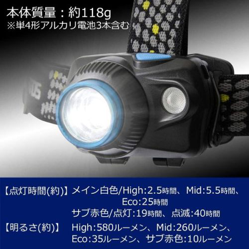 | 連続点灯(時間) | Max/3時間、Hi/4時間、Mid/10時間、Low/40時間間 |