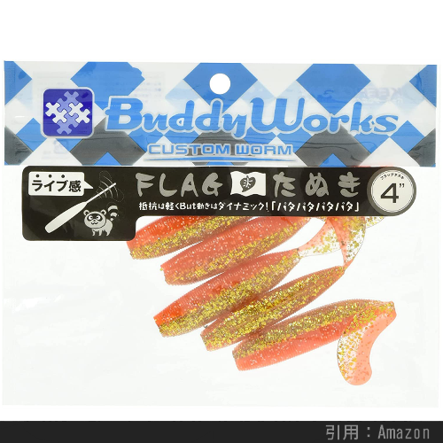 価格が安く、必要十分なアクションが特徴的なパラワームです。シャッド以外にもダート、グラブ等様々なタイプのワームが選べ、すべて他ワームに比べると廉価で買い求められます。ラメは派手過ぎず地味過ぎない絶妙なライン。オレンジゴールドがおすすめカラー。