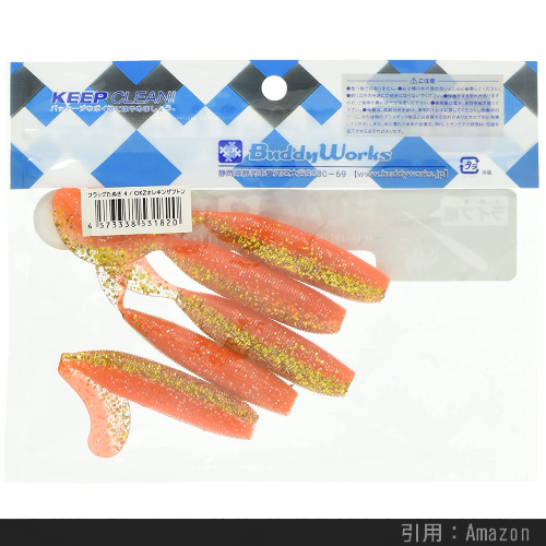 筆者が初めてヒラメフラットフィッシュを釣った記念ルアーでもあり、あれから数年経った今でも愛用しています。なにも筆者の個人的な感想ではなく、Amazon、Twitter、Youtubeいたるところで高評価されているロングセラーのワーム。超ゆっくり巻いてもテールがチョロチョロと動き、ヒラメに限らずアイナメやクロソイなどの根魚にも効果的。3インチが絶版になってしまったのが残念なところ…(釣れすぎたのか…??)