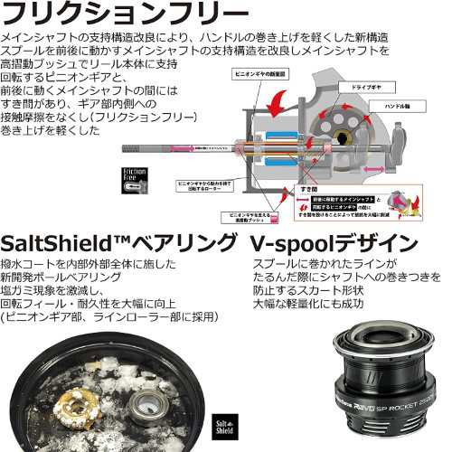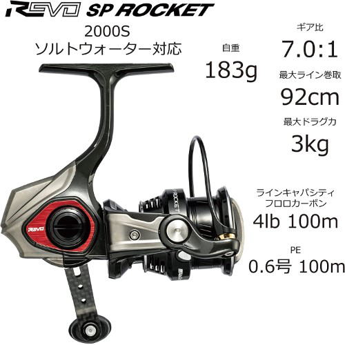 スーパーハイギア(ギア比7!)が特徴のレボ SPロケットです。名前の通り、ロケットマネジメントシステムを搭載しており、最適な巻取りアングルで、ラインをより滑らかに均一にスプールへと巻き取ることができます。執筆時現在、ギア比が7を超えるモデルは激レアだったりします。