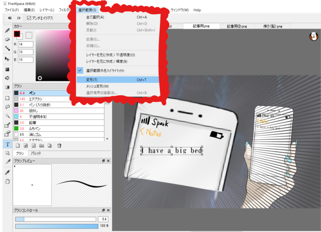 あとはメニューバーの『選択範囲』のところで『変形』をクリックすれば上の画像のようにテキストの大きさは勿論、回転させることができるようになりました。