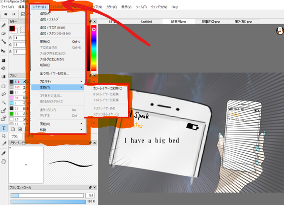 画面のようにメニューバーの『レイヤー』を選び、『変形』を選び、『カラーレイヤーに変形』をクリックすればテキストレイヤーから普通のレイヤー(カラーレイヤー)に変わります。