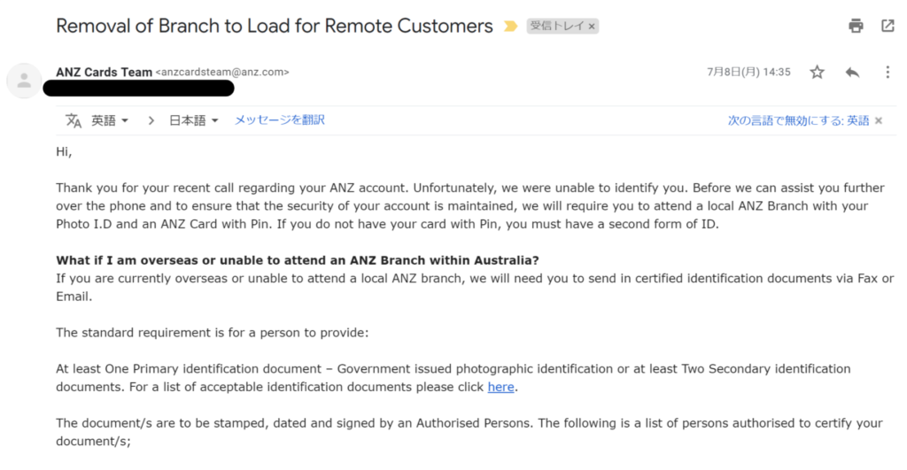 (もし貴方が海外にいて直接ANZの支店に行けない場合、FAXかメールにて特定の身分証明書類を送る必要があります。)