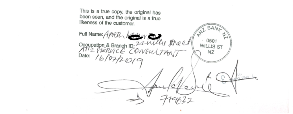 また、日本のANZ支店(東京)に確認してみたところ、サイン(スタンプ)の発行元として適正なのは