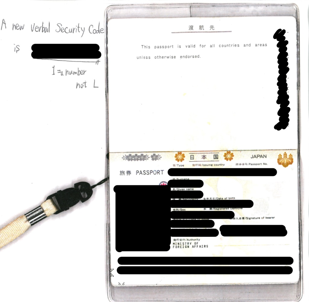 次に、スタンプを貰った紙の空いたスペースに、口頭質問用の新しいVerbal Password(Security code)を記入して(上画像 参照)、メールに送付。