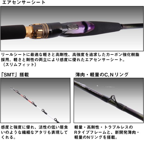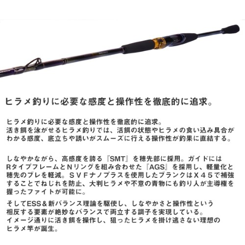 2023年登場のヒラメ釣りに必要な感度と操作性を徹底的に追求したと言われるダイワの最高級モデルです。しなやかながら高感度を誇る『SMT』を穂先部に採用。ガイドにはRタイプフレームとNリングを組み合わせた『AGS』を採用。SVFナノプラスを使用したブランクはX45で補強することでねじれを防止、大判ヒラメや不意の青物にも釣り人が主導権を握ったファイトが可能になっています。イメージ通りに活き餌を操作し、狙ったヒラメを掛け逃さない理想のヒラメ竿です。
