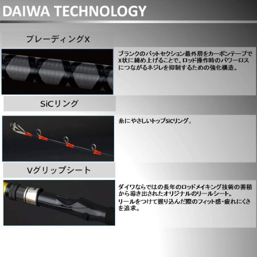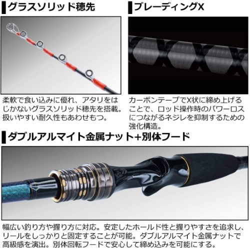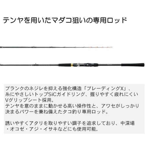 ブランクのネジレを抑える強化構造「ブレーディングX」、糸にやさしいトップSiCガイドリング、握りやすく疲れにくいVグリップシート採用。テンヤを意のままに動かせる高い操作性と、アワセがしっかり決まるパワーを兼ね備えています。誘いやすくアタリを取りやすい調子を追求しており、中深場・オコゼ・アジ・イサキなどにも使用可能。