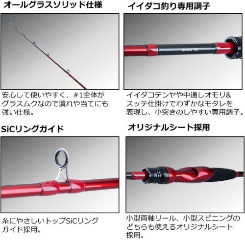 テンヤを用いたイイダコ釣り専用ロッドです。イイダコテンヤや中通しオモリ&スッテ仕掛けでわずかなモタレを表現し、小突きのしやすい専用調子になっています。価格もお手頃な、ハイコスパロッドです。