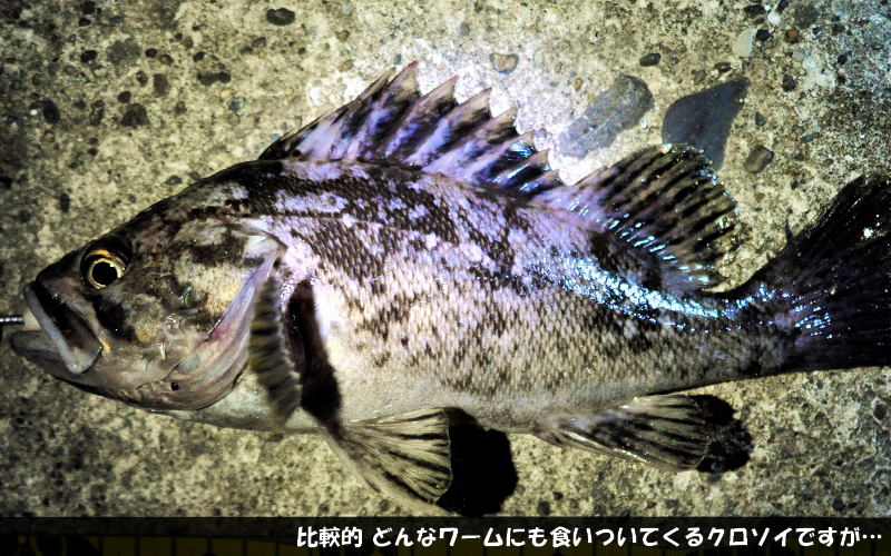 口が大きいクロソイで、活性が高いときには自信の体長と同じくらいの大きさのワームにも食いついてくるのですが、