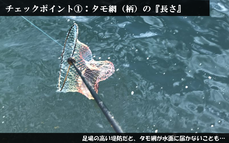 が最も重要です。網が海面に届かないことには魚を取り込めません。筆者は水面までの足場の高い(6mほど)堤防に良く行きますが、ランディングシャフトが短すぎて水面に届いていないような方をよく見かけます。この前、手伝った方に『何mのタモ網なんですか?』と聞いてみたところ、