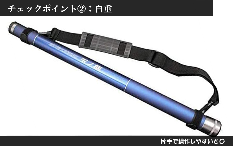 例として筆者が現在使用しているタモ網の柄は7mで850g程です。一般成人男性(身長174㎝、体重66㎏)としては、