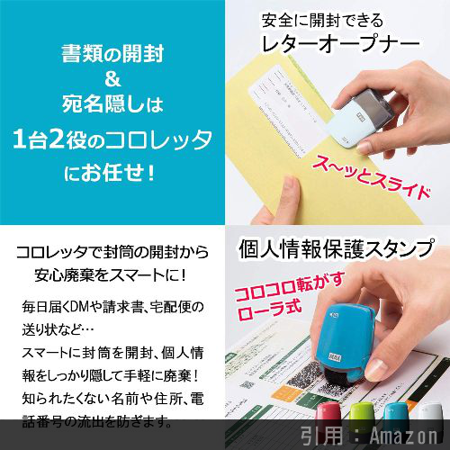 請求書、宅配便の送り状などに書かれた知られたくない名前や住所、電話番号など個人情報をコロコロしっかり隠せる「個人情報保護スタンプ」を搭載した手動レターオープナーです。湾曲面でも、転がしながらしっかり捺印。切りくずが出ないレターオープナーを搭載。紙粉を収納する紙粉ポケット付きです。