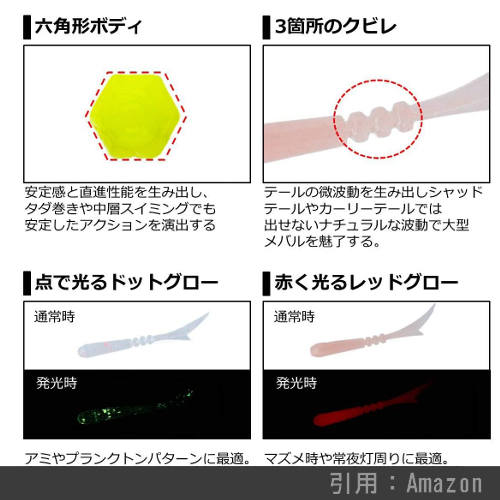 尻尾がストレートのピンテールが基本。波動がナチュラルなため違和感を与えづらく、警戒心の高いメバルも良く釣れます。