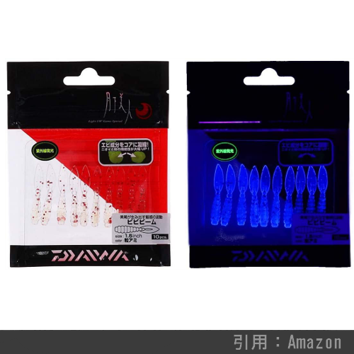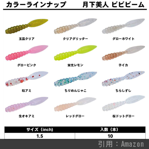 カラーに合わせて2種類(イカ・エビ)の集魚剤が内蔵されており、大小問わずメバルの釣果が非常に高いビビビームです。パドルテールも極薄(0.6㎜)なので小メバルの吸い込みも妨げ難くなっています。セットする向きで波動が変化するのも特徴。フォールスピードを自在にコントロール可能だったりと、出来る事が非常に多いワームです。
