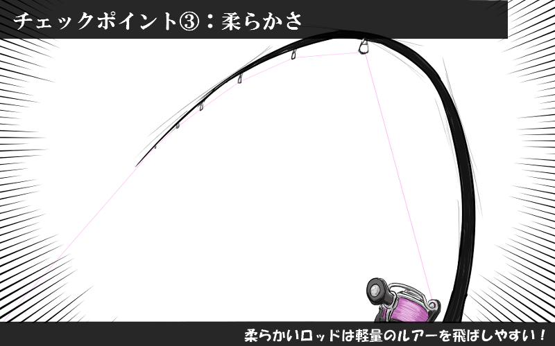 キャロライナリグなどをキャストするような、遠投が必要な場合は最適。軽量のルアーは扱いにくいモノが多いので、1本目としては不適。