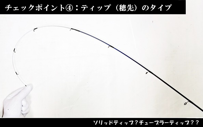 ティップ(穂先・竿の先)もチェックポイントのひとつです。ソリッド・チューブラーの2タイプがあり、簡単に分けると、