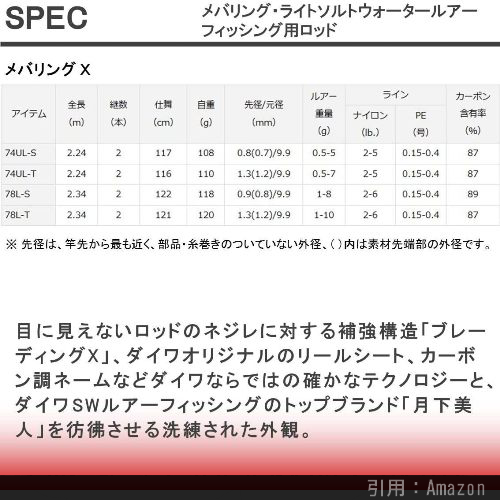 バイトに対する感度が高く、力強くフックを貫通させるパワーにも優れたチューブラーティップを採用したメバリング専用ロッド。軽量なジグヘッドから小型プラグまで様々なリグに対応。価格が非常に安いので『とりあえず』としてのメバリング入門用におすすめ。
