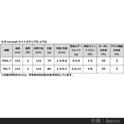 メバリングとして一番汎用性が高く、軽量のルアーから少し重めのプラグまで投げられる。ヘチ釣りにも丁度良く、ロッドにハリがある。 - ML(ミディアムライト)