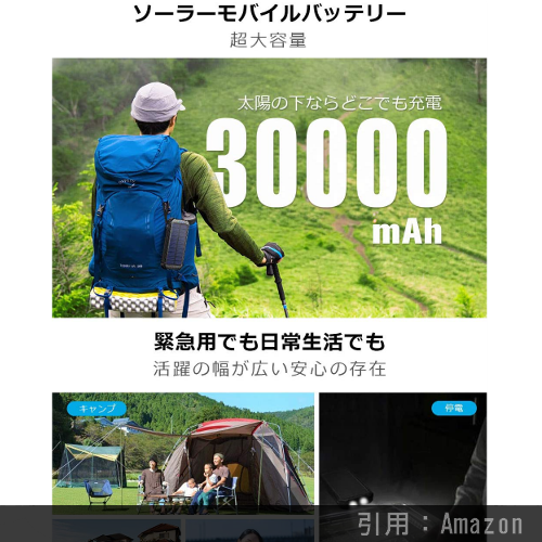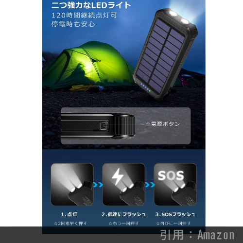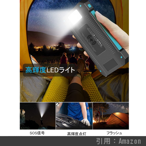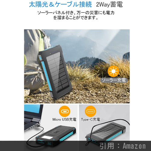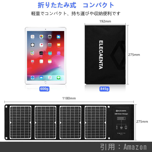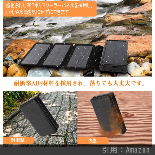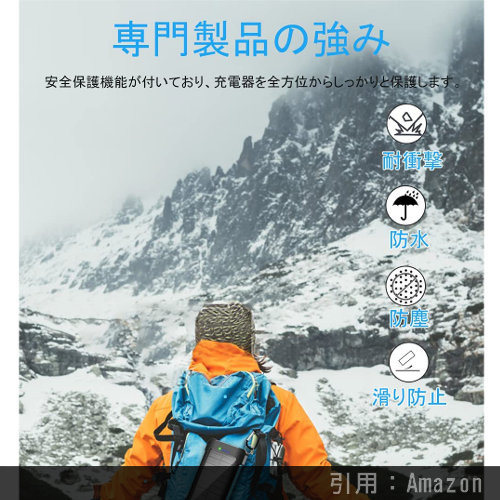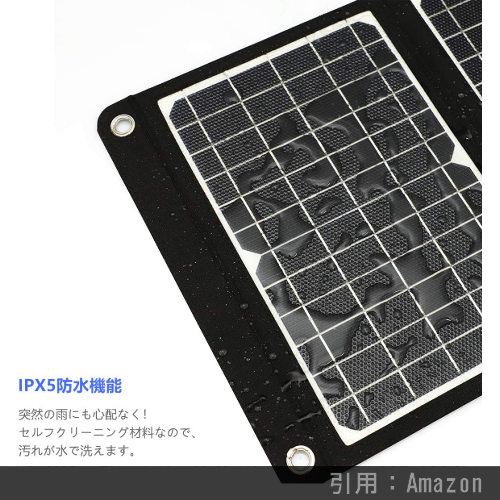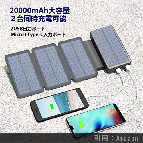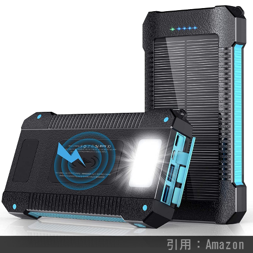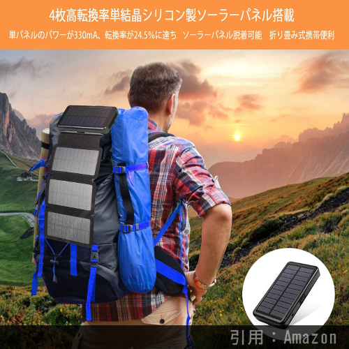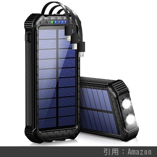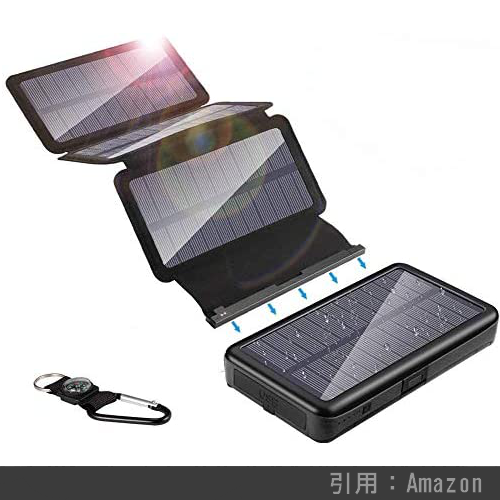 転換率が高く、ソーラーパネルが複数枚あることから本格的に電力を生み出すことが可能。別途で充電器を用意する必要がありましたが、近年ではモバイルバッテリー付属のタイプもあるようです。やや重量が重たくなりますが、それを補って余る実用性があります。
