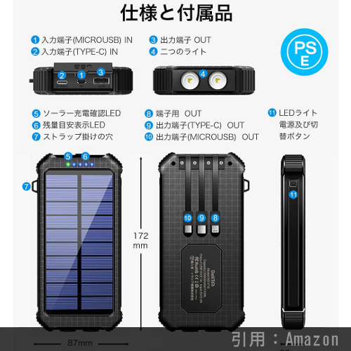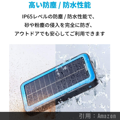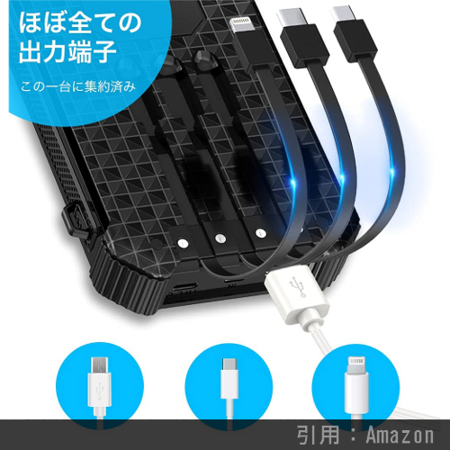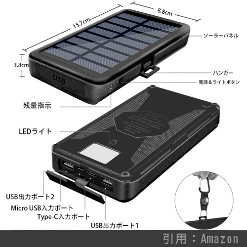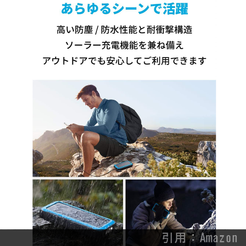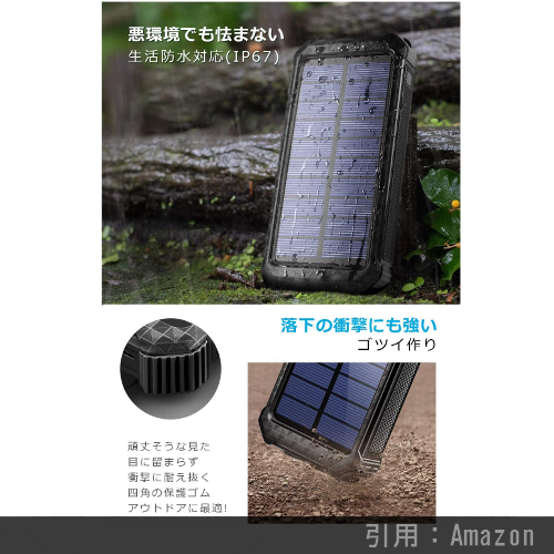 外見はヘビーデューティ仕様で耐衝撃、防水機能も備わっておりアウトドアで大活躍してくれるでしょう。40000mAhという大容量さなので、1週間を超すキャンプとかでなければ1回のフル充電で事足りそうな塩梅。ソーラー充電と入出力の豊富さもポイントです。