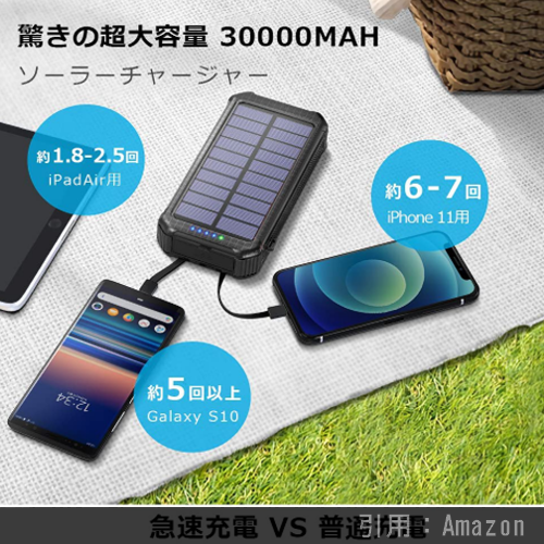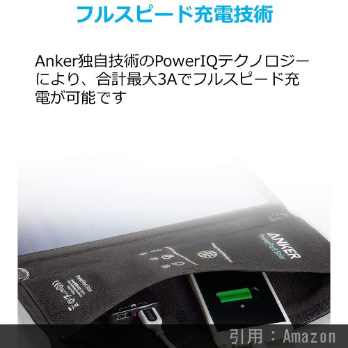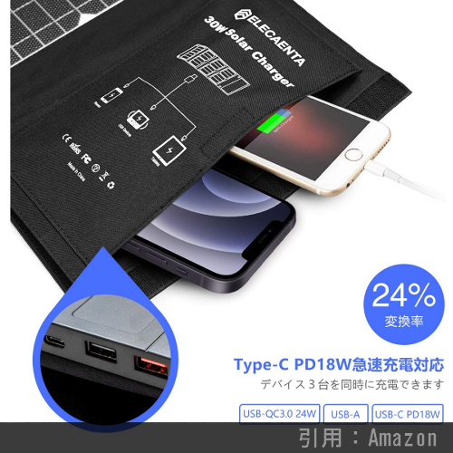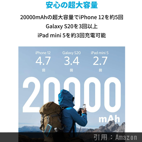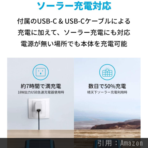 最大出力18WのUSB-Cポート、さらには最大出力12WのUSB-Aポートが特徴のソーラーモバイルバッテリーです。 USB-Cポートを利用すれば、iPhone 12ならわずか30分で最大50%まで充電できます。また、粗悪な激安メーカーではないので日本語対応のカスタマーサービスも◎。