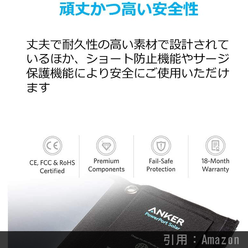 モバイルバッテリーとしての側面はないので、ソーラーチャージャーとしての機能に優れています(もちろん別の充電器と併用してもOK)。丈夫なポリエステル布地と、高耐久PETポリマーのソーラーパネルを採用。どんな天候でも耐えられるような頑丈設計。アウトドアで使いたい方に非常におすすめのソーラーチャージャーです。